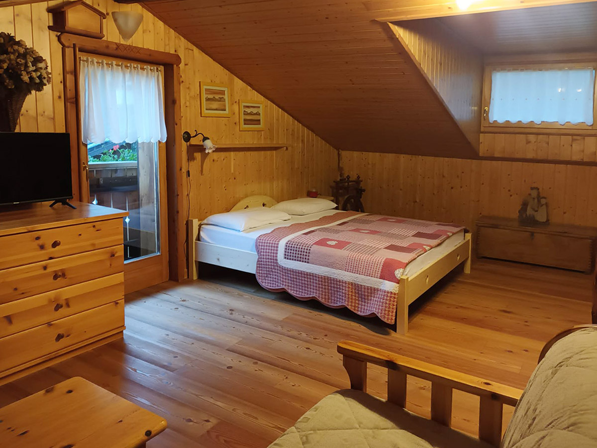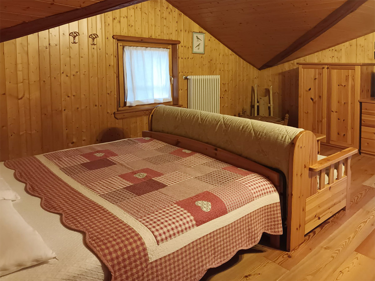 Casa singola, con sole due unità abitative, per uso turistico. Parcheggio esterno e un grande prato attrezzato con tavolo sedie e barbecue a disposizione dei clienti. Al piano primo c’è un’appartamento trilocale con 2 camere e soggiorno-cucina molto spazioso con divano letto, bagno, adatto a 4-6 persone. L’appartamento grande, invece, si sviluppa su due piani ed è composto da 3 camere, 2 bagni, e grande soggiorno-cucina, adatto a 7-8 persone. Nella zona piano terra è a disposizione dei clienti una grande stanza riscaldata adibita a ski-room attrezzata di scaldascarponi in inverno, e deposito biciclette o altro in estate.